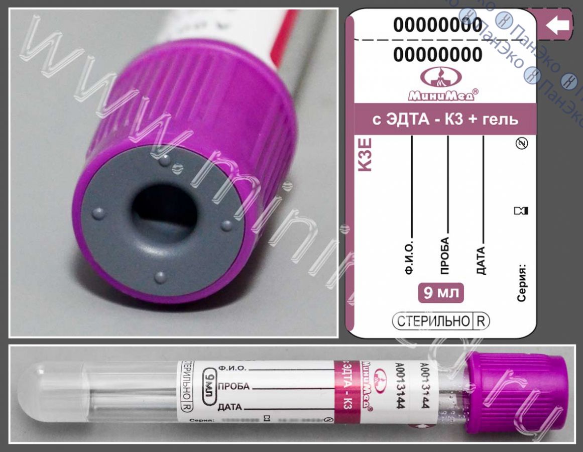 Пробирка вакуумная с К₃ЭДТА и разделительным гелем, 9 мл, Ø 16 × 100 мм, Минимед (В НАЛИЧИИ)