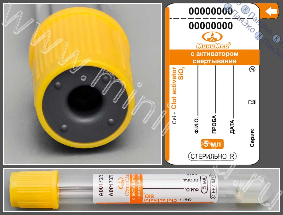 Пробирки вакуумные с активатором свертывания и гелем, 5 мл, Минимед