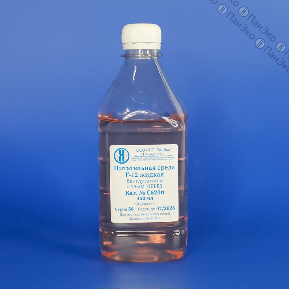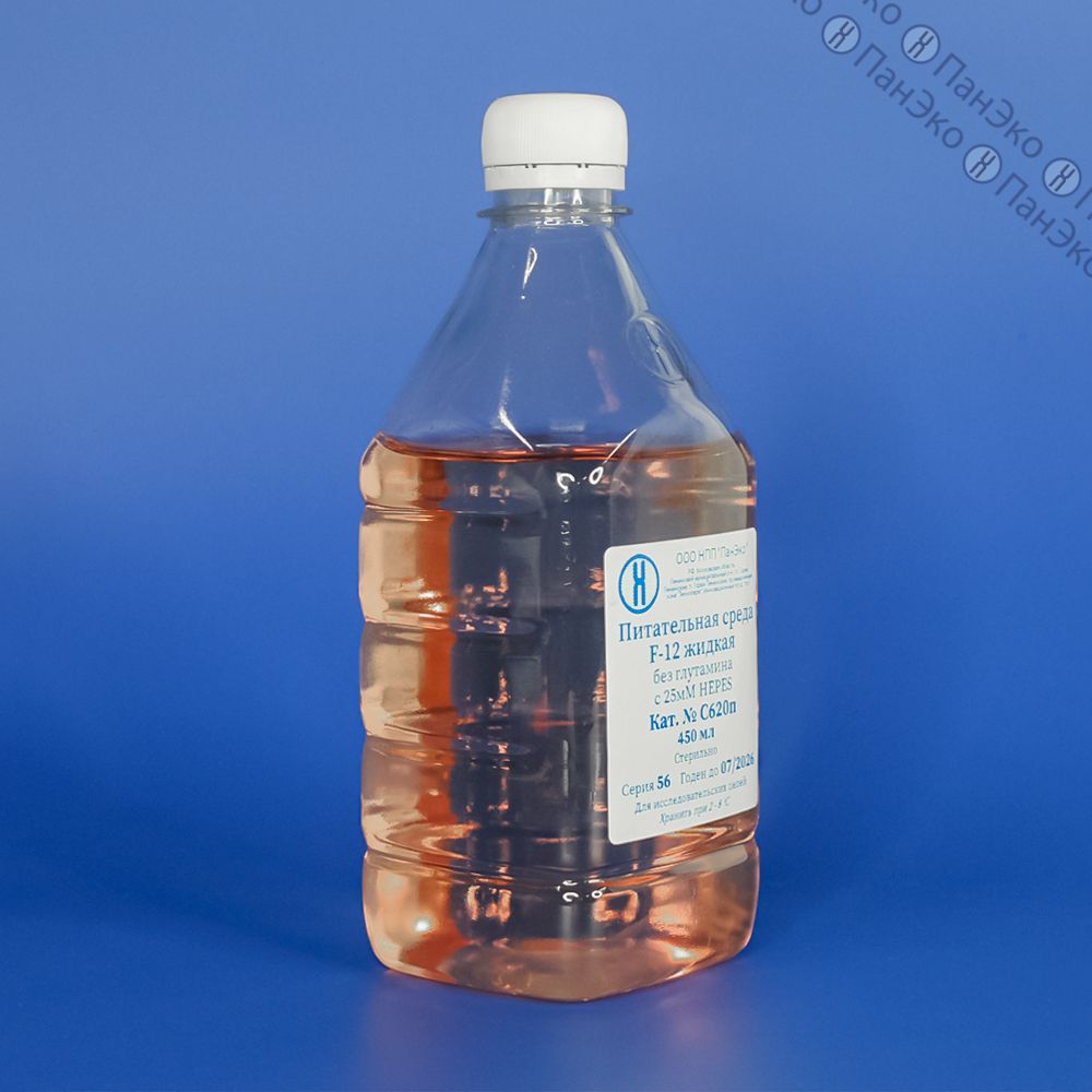Питательная среда F-12 жидкая представляет собой растворённую в очищенной воде смесь неорганических солей, аминокислот, витаминов, глюкозы и фенолового красного, простерилизованную методом мембранной фильтрации. Антибиотиков не содержит.