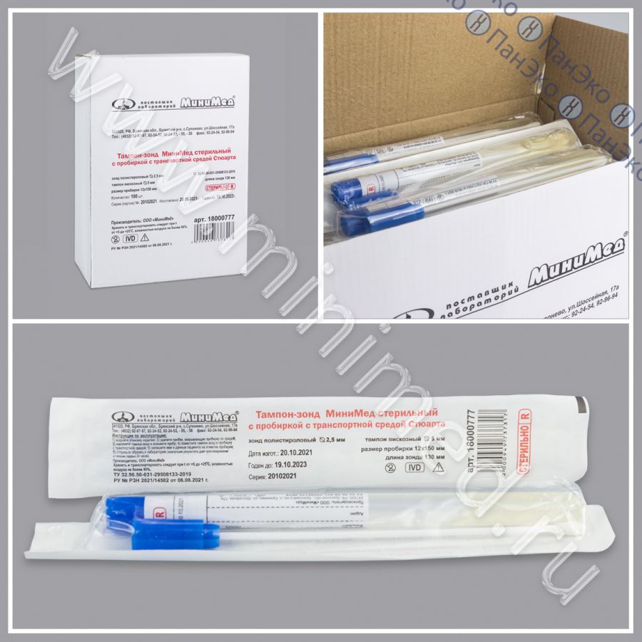Зонд-тампон в пробирке со средой Стюарта, вискоза+пластик, стерильный, Минимед