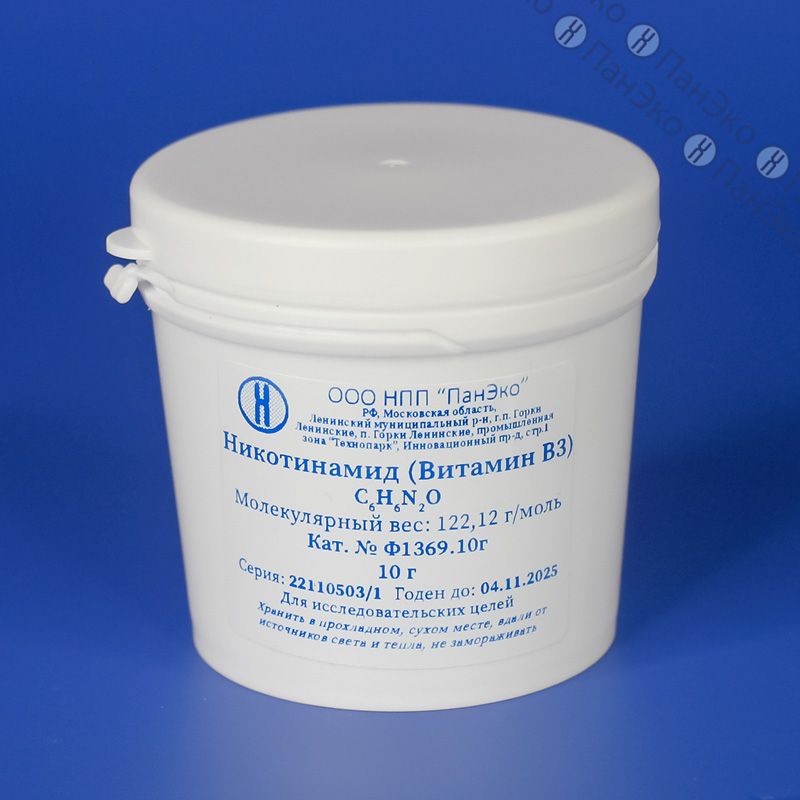 Водорастворимое вещество, производное витамина B3. Является активный компанентом коэнзимов НАД и НАДФ. НАД/НАДФ - критически важные для жизни ферменты, т.к. они участвуют в окислительно-восстановительноых процессах в клетке, обмене питательных веществ (в первую очередь в гликолизе), цикле Кребса, дыхательном цикле переноса электронов.