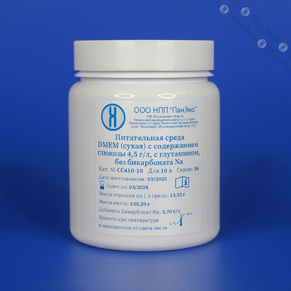 Сухая среда DMEM с глутамином, без бикарбоната Na, содержание глюкозы 4,5 г/л, на 10 л